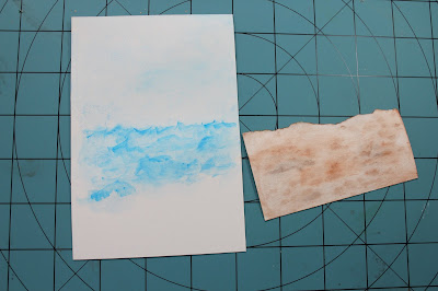 I used some water colors on the sky and the water, using the brush to make the waves.  Next I tore another piece for the sand beach and also used the water colors for some texture.